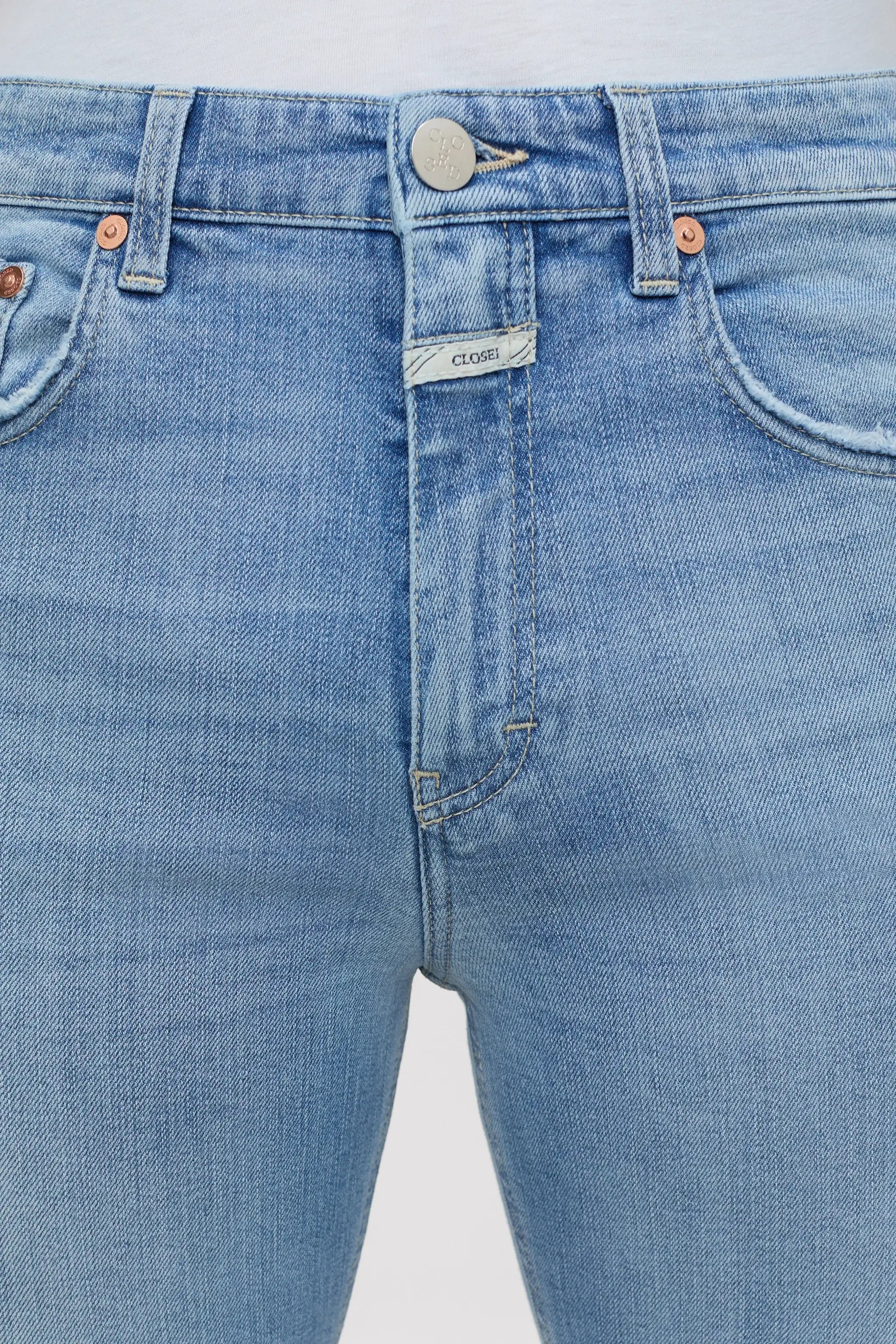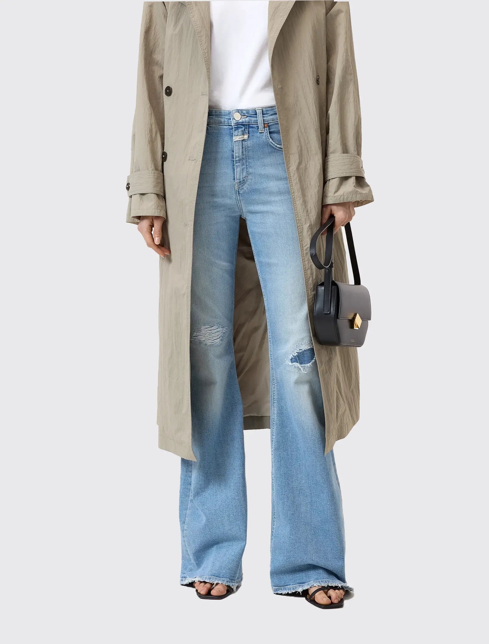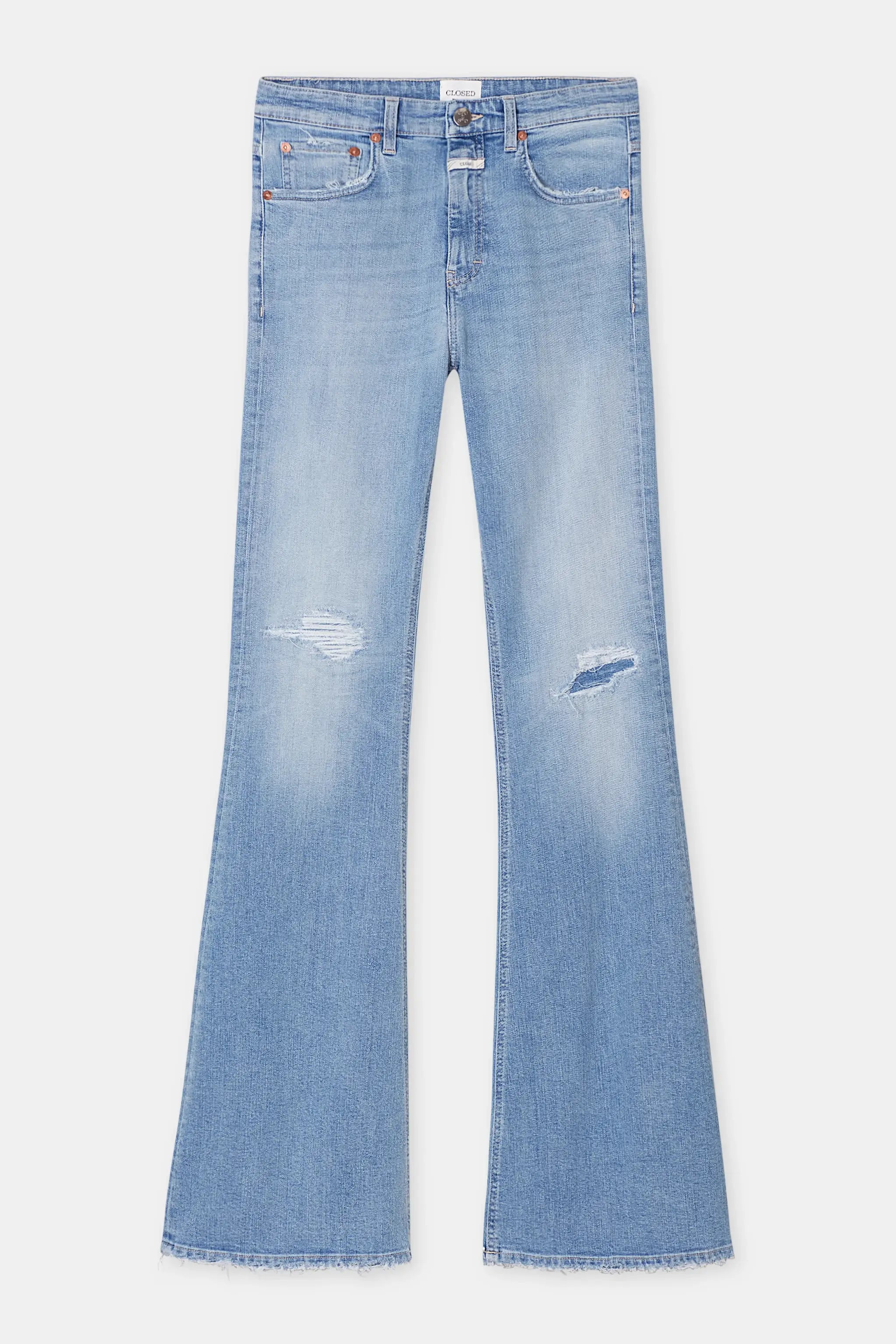 Our popular 5-pocket jeans in a flared fit with a high waist. Made from mid-weight super-stretch denim (11 oz.) with a comfortable stretch for maximum wearability. The light blue wash features subtle hand-finished destroyed effects. These jeans are part of our eco-friendly A BETTER BLUE line, demonstrating that it's possible to significantly reduce the use of chemicals, water, and energy in denim production. Made in Italy.